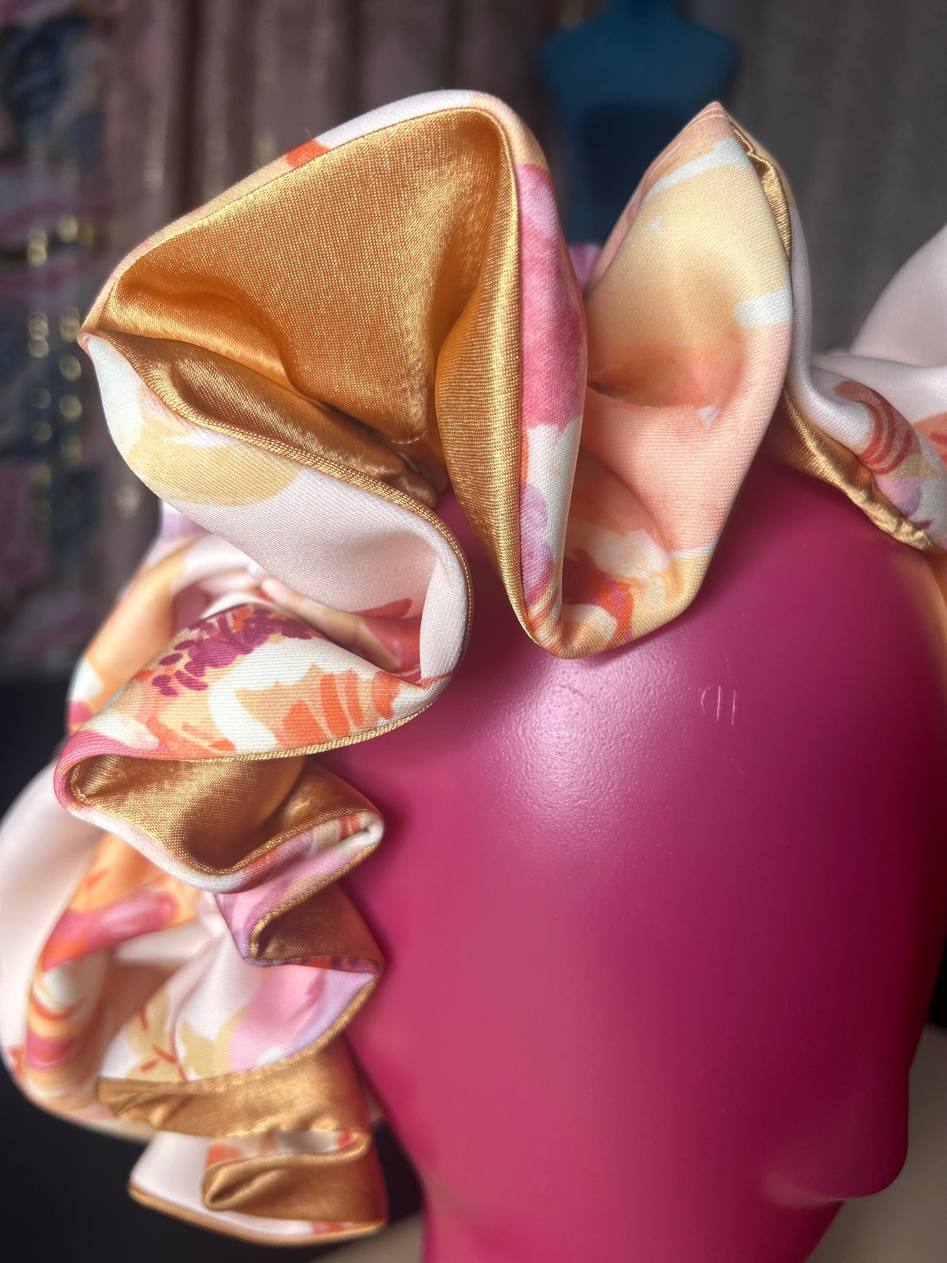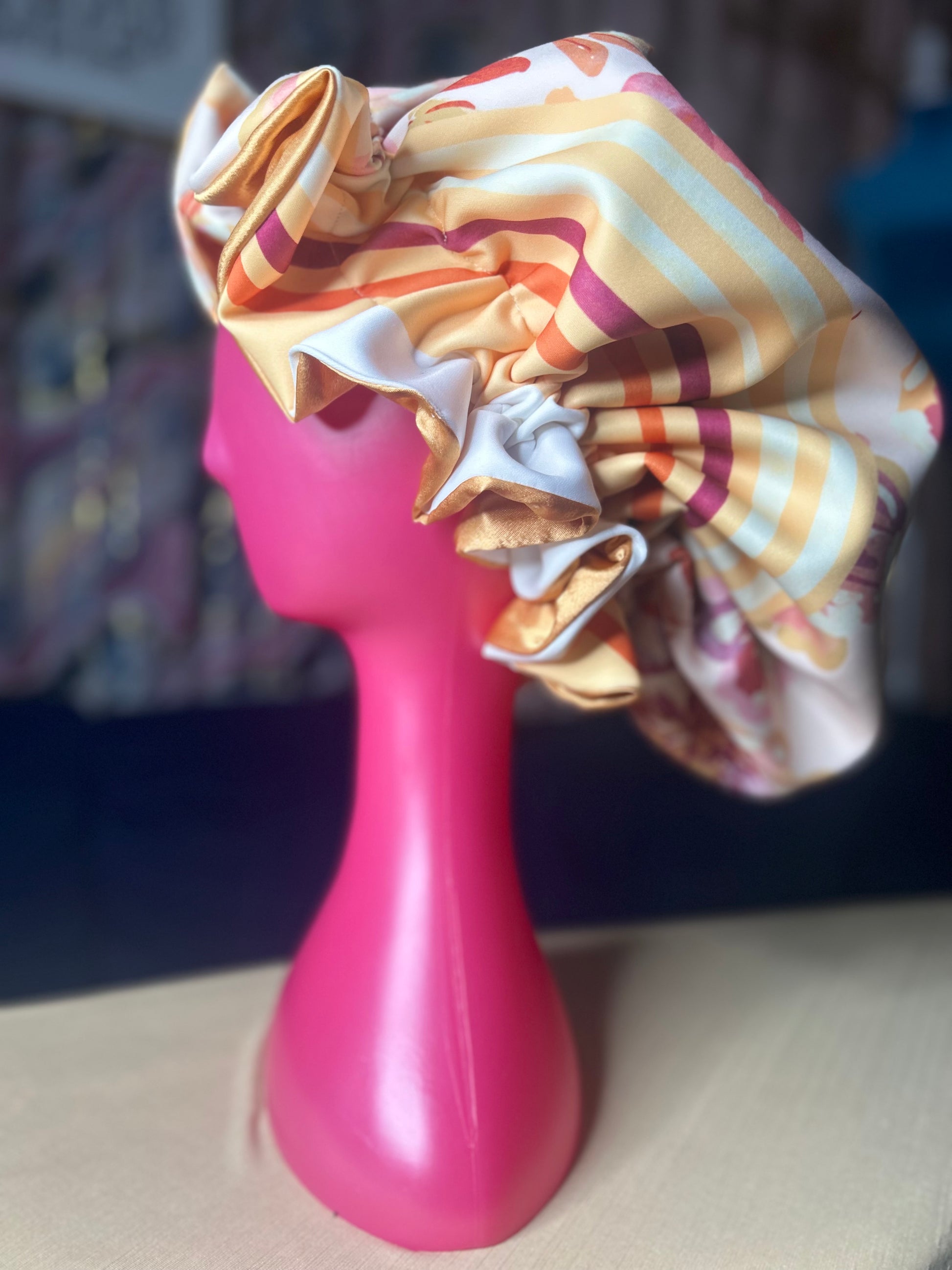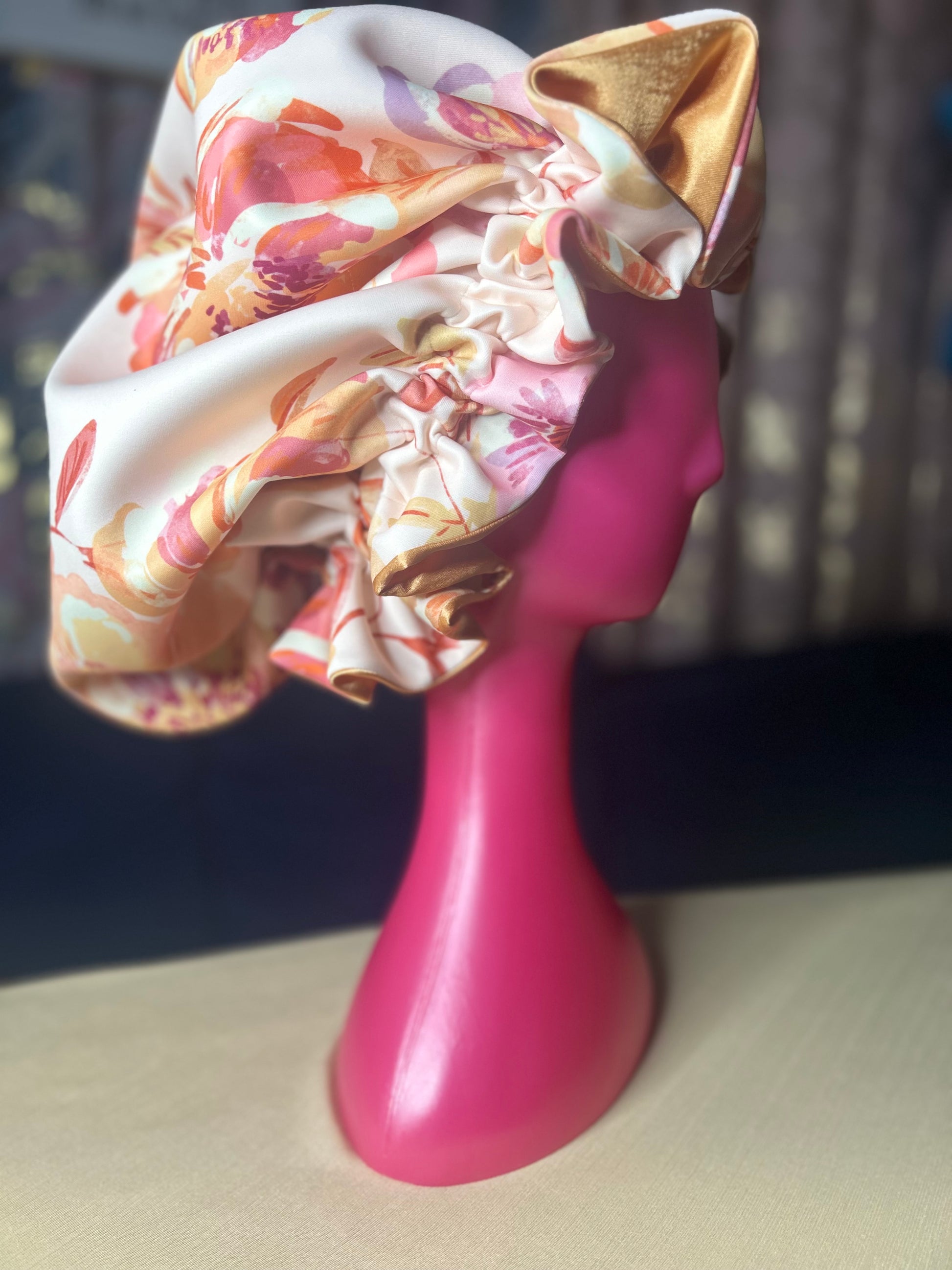This bonnet features a delicate watercolor floral print paired with a rich golden satin lining, creating the perfect blend of beauty and protection. The oversized, ruffled silhouette is designed to comfortably fit locs, braids, curls, and voluminous natural hair, while maintaining the luxurious look your brand is known for.